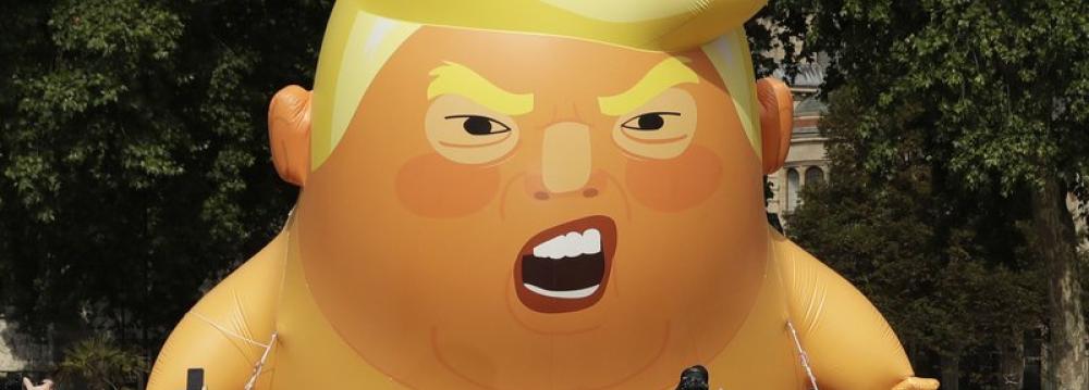 The six-meter high inflatable balloon depicting the US president as a nappy-clad baby holding a mobile phone was brought north of the border to be flown at a protest in Edinburgh. The balloon was above Parliament Square in London on Friday.