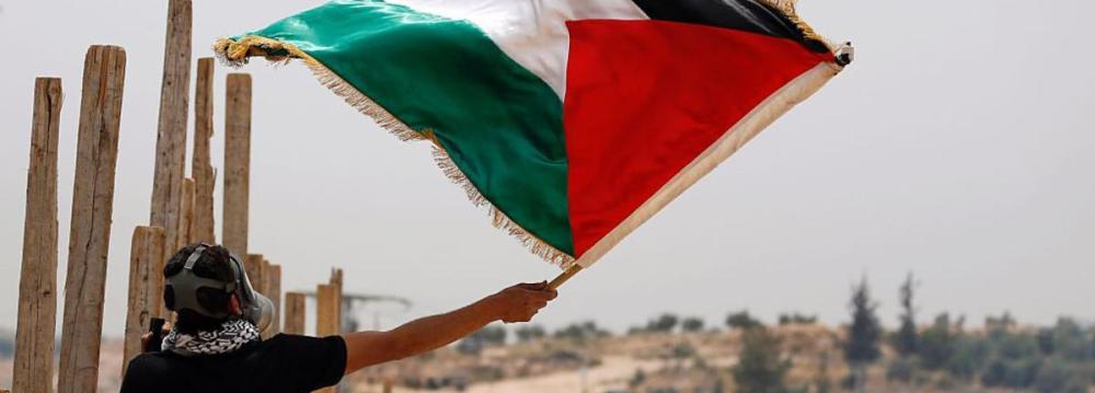 Caption: A Palestinian protester waves a flag in front of Israeli security on May 13, 2016, in the West Bank, Palestine. (File Photo)