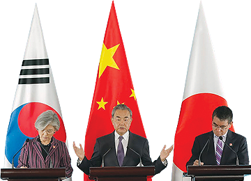 China, Japan and South Korea sought to find common ground on Wednesday amid an escalating trade dispute between Tokyo and Seoul that has further soured relations between the two countries.