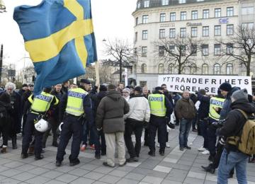 InternationalSwedish police have made three arrests following reports that scores of black-clad men targeted foreigners, as they rampaged through central Stockholm on Friday.